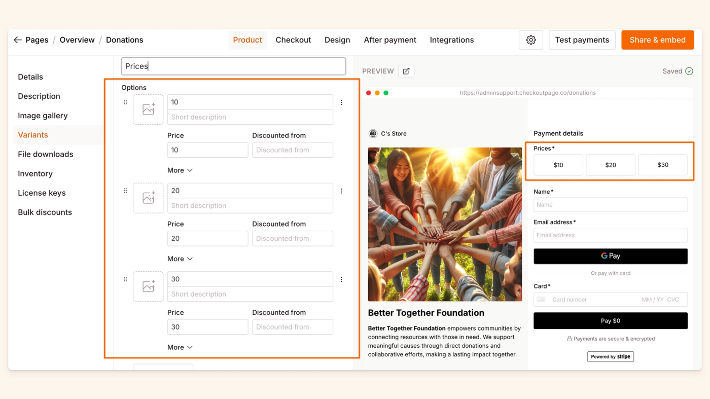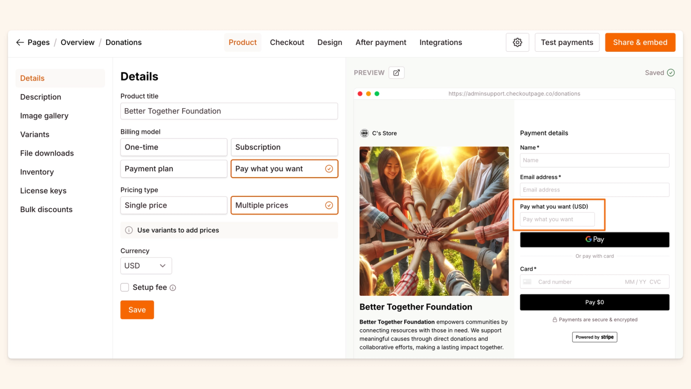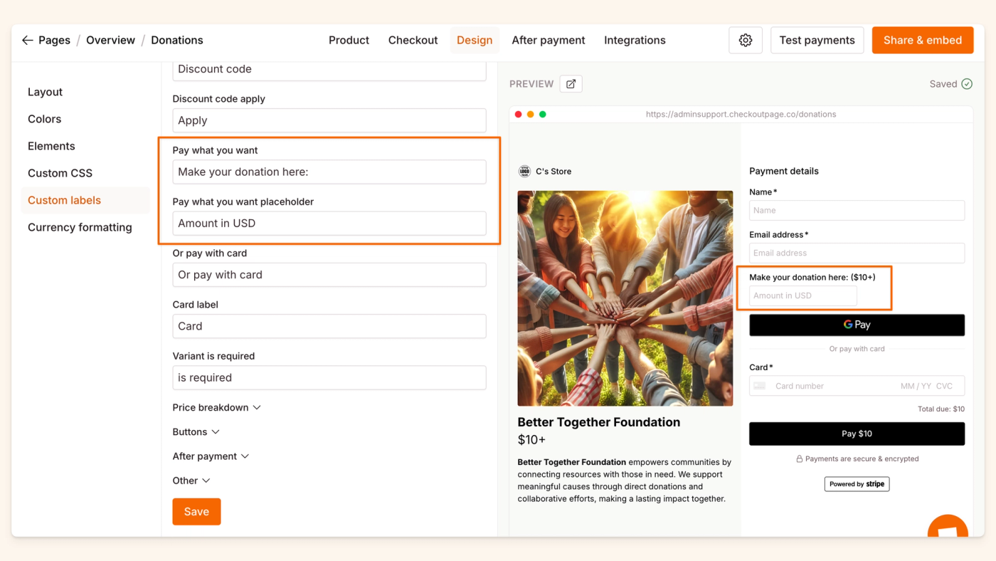 For example, by changing the label text Pay what you want to something like “Make your donation here”, you’ve repurposed your checkout!