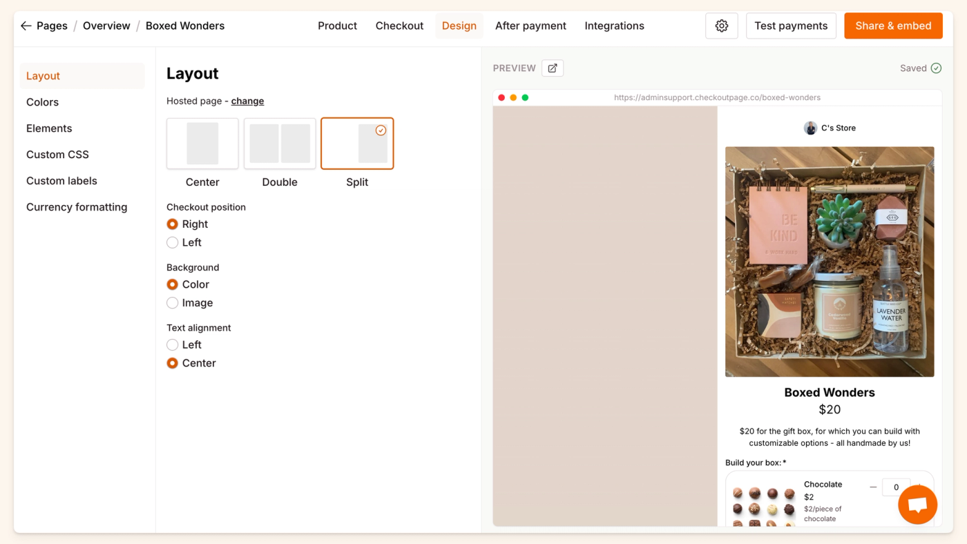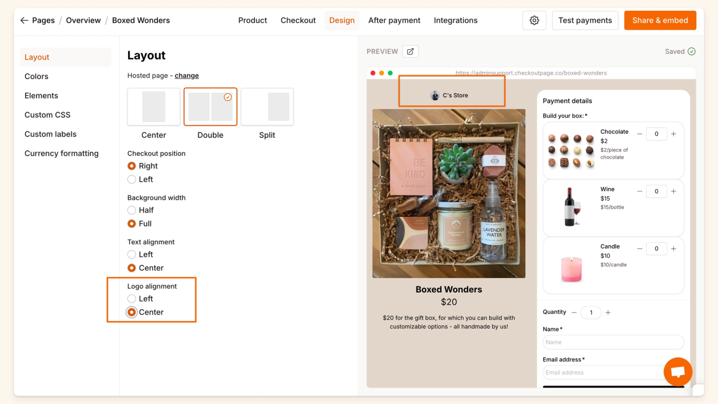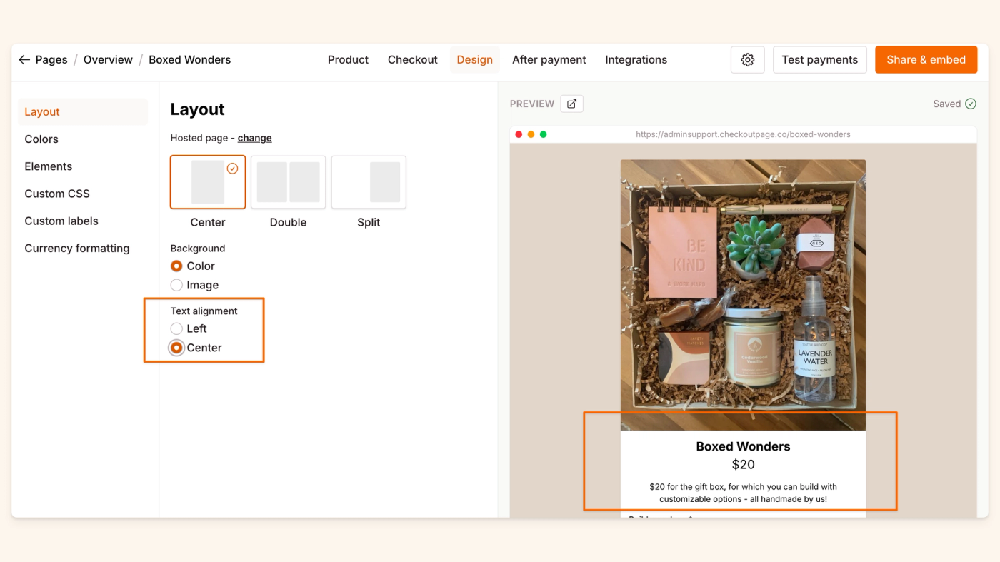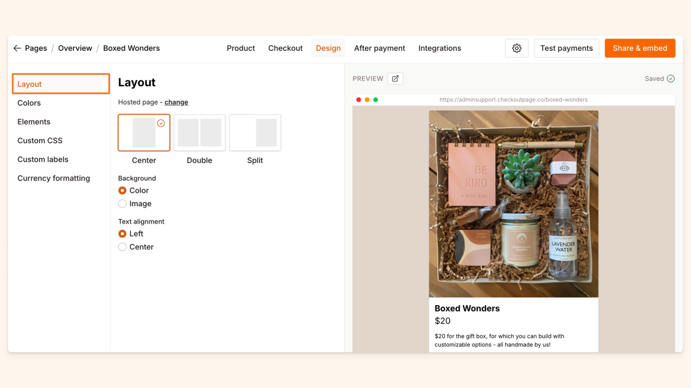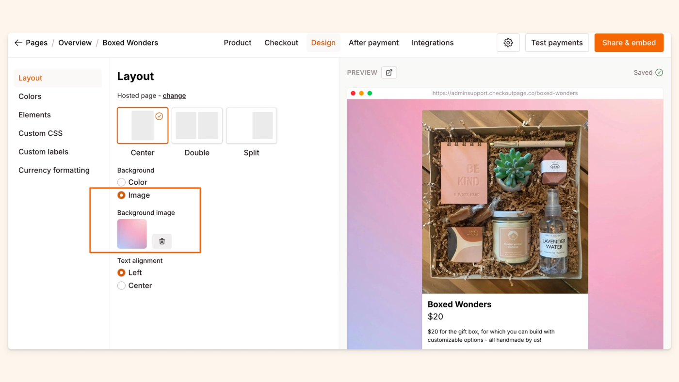 This is where you can change the layout of your page both as a hosted page and a pop-up.