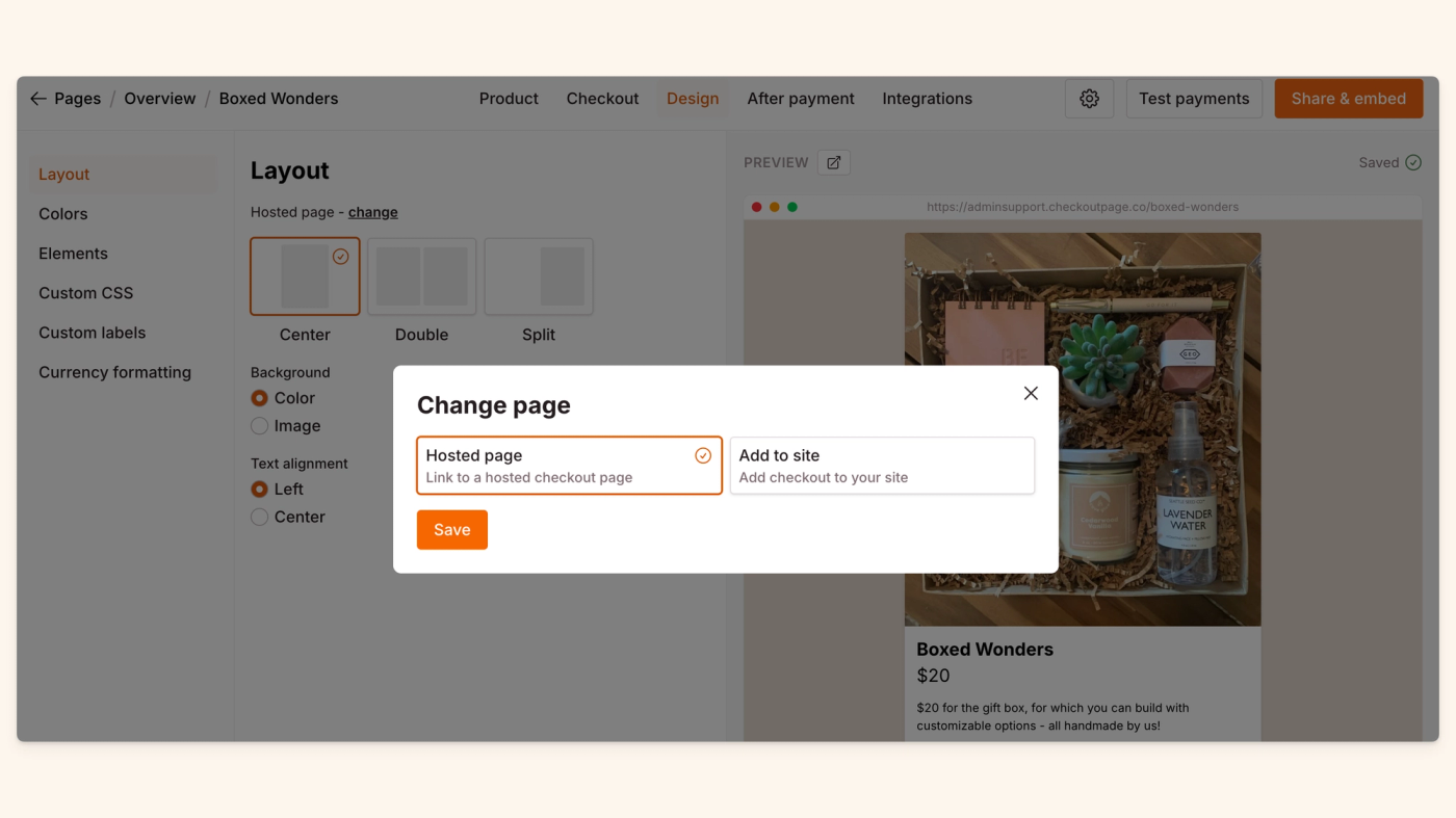 When you've first set up your page, you've chosen if the page is a Hosted Page by Checkout Page or if it will be added to your site. You can change this in the Design - Layout settings by clicking change.
