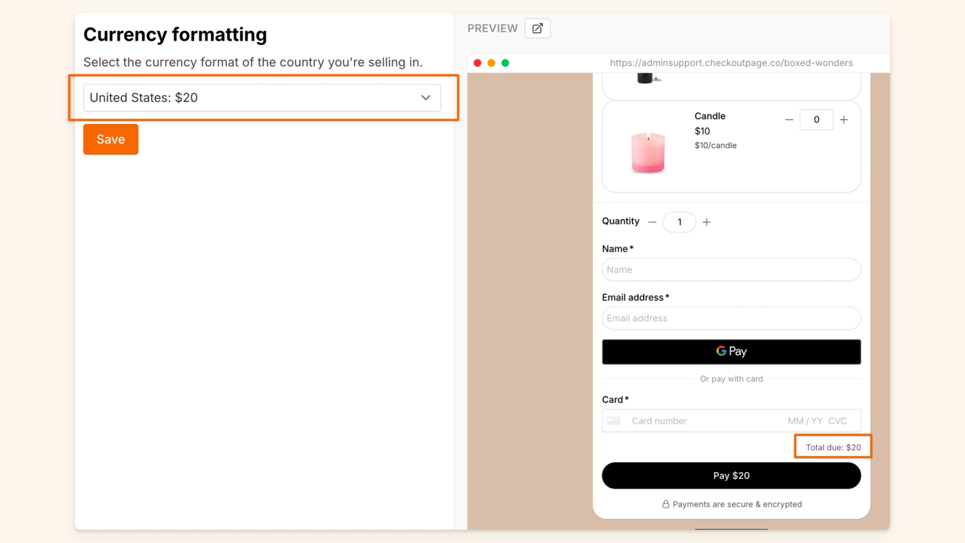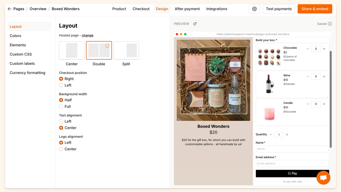 Checkout Page makes it easy for you to customize your one-page checkout or form. Add your logo and colors, change the text, or even change the design with CSS.