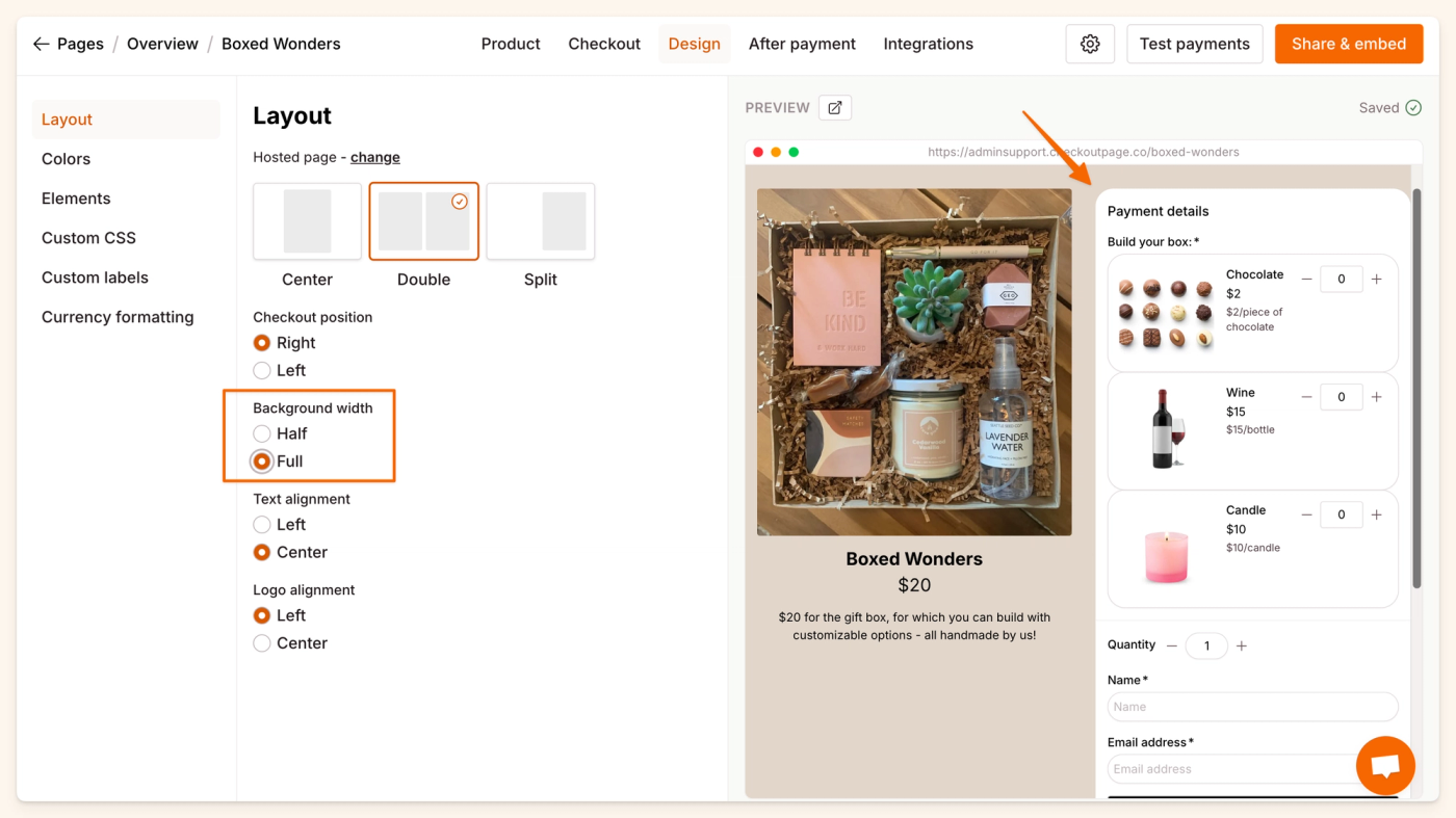 By default, the Double layout is Half, which only shows the background on the side the product/service information. However, selecting the background width of Full shows the background behind the checkout content side as well.