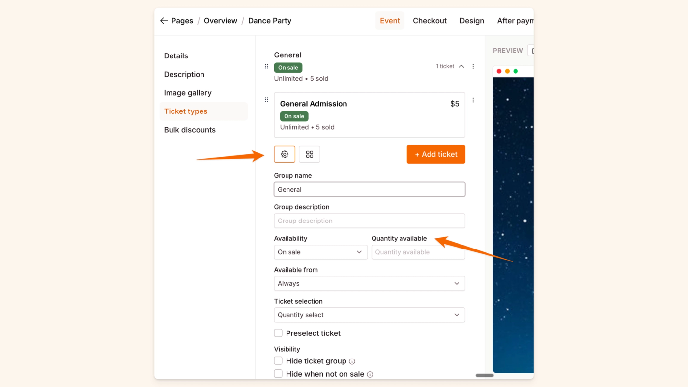 Our event pages have three interconnected settings to help you manage the number of tickets sold: