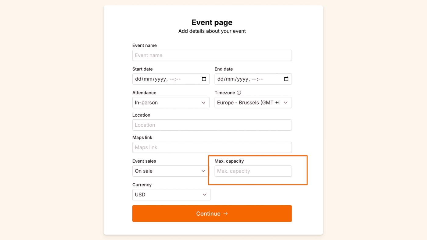 - Event maximum capacity: The maximum number of tickets that can be sold from all ticket types.