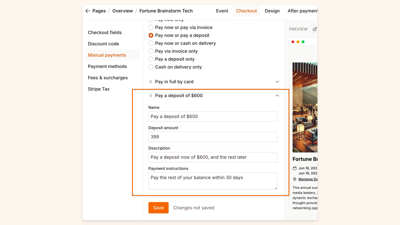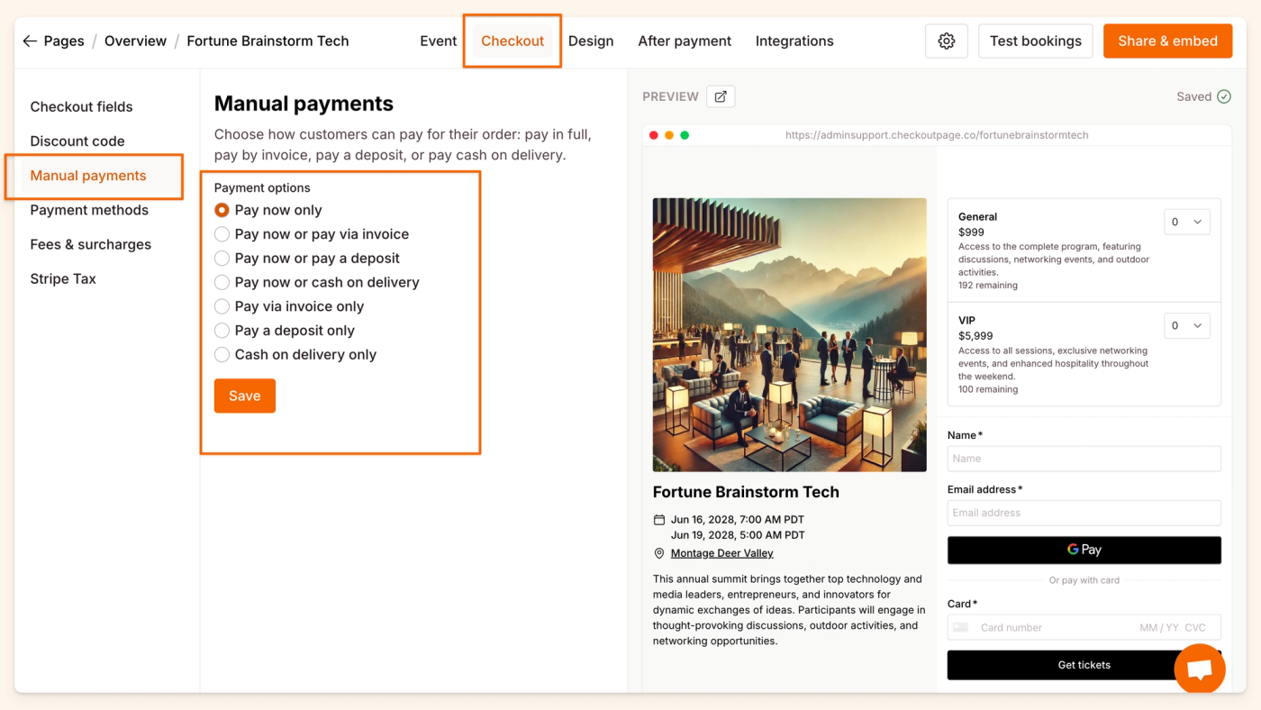Manual payment options let you offer alternatives to full payment at checkout: invoices (pay later), deposits (partial payment now, remainder later), or cash on delivery. Manually collect unpaid amounts outside Checkout Page.