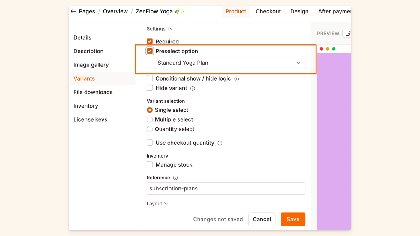 Preselecting variants populates the variant selection with a default choice through query parameters. Customers see the preset option selected and can change it if needed.