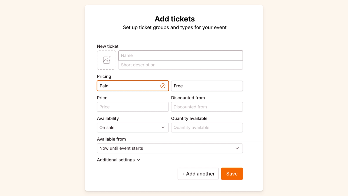 - Decide if the ticket will be paid or free. If it's a paid ticket, you'll need to set a price. You can also add a "discounted from" price to show any discounts.