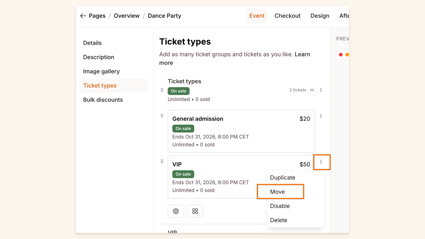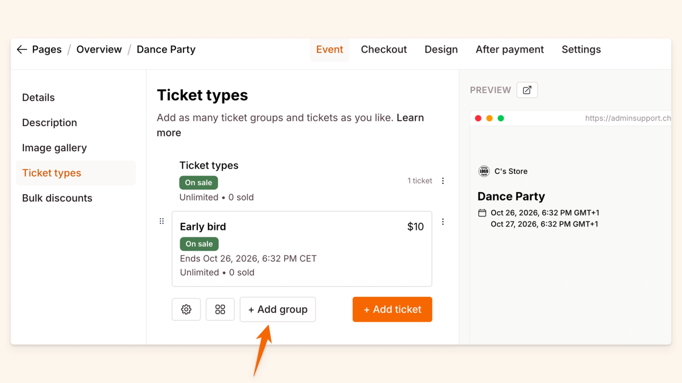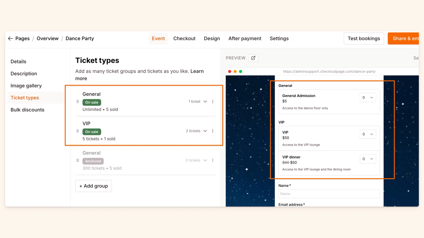 Adding and managing ticket types and groups on your event page allows you to offer a range of ticket options to your attendees.