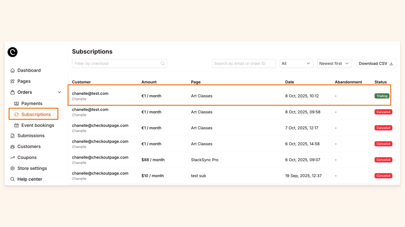 - Locate the report of the subscription purchase in question in your Checkout Page account. It will be under Subscriptions on the left-hand side menu. Click on the subscription report.