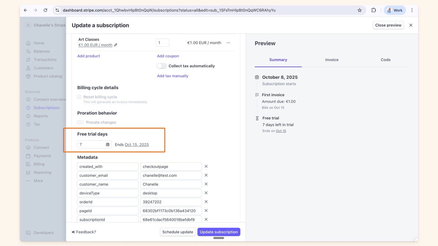 Once a subscription payment has been made, you can extend or shorten the customer's free trial. This can be done within your Stripe account by the following steps: