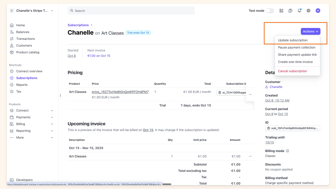 3. You will then be taken to the subscription purchase report within your Stripe account in a new tab. Click Actions from the top right corner, and then Update subscription.
