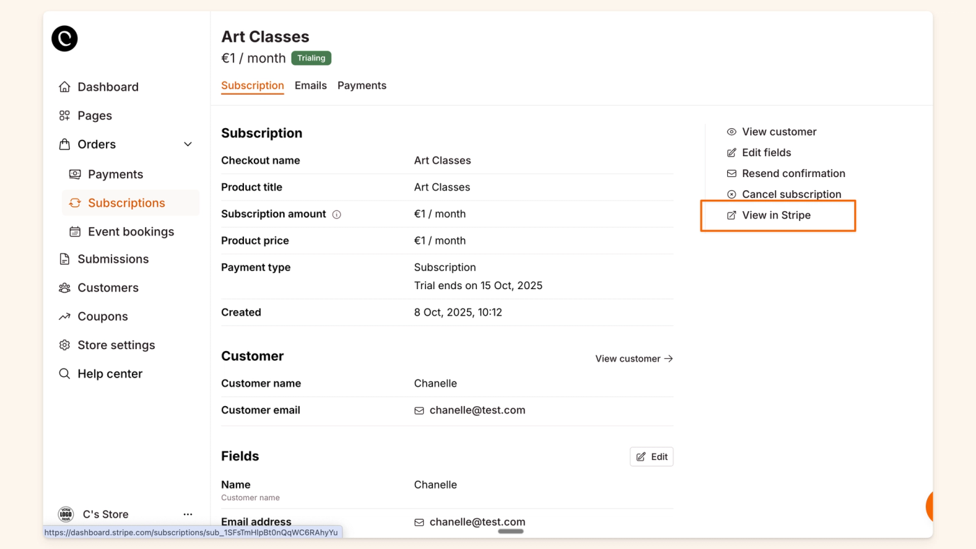 2. You will be then taken to the detailed report of the subscription purchase. Click "View Stripe" on the right side menu.
